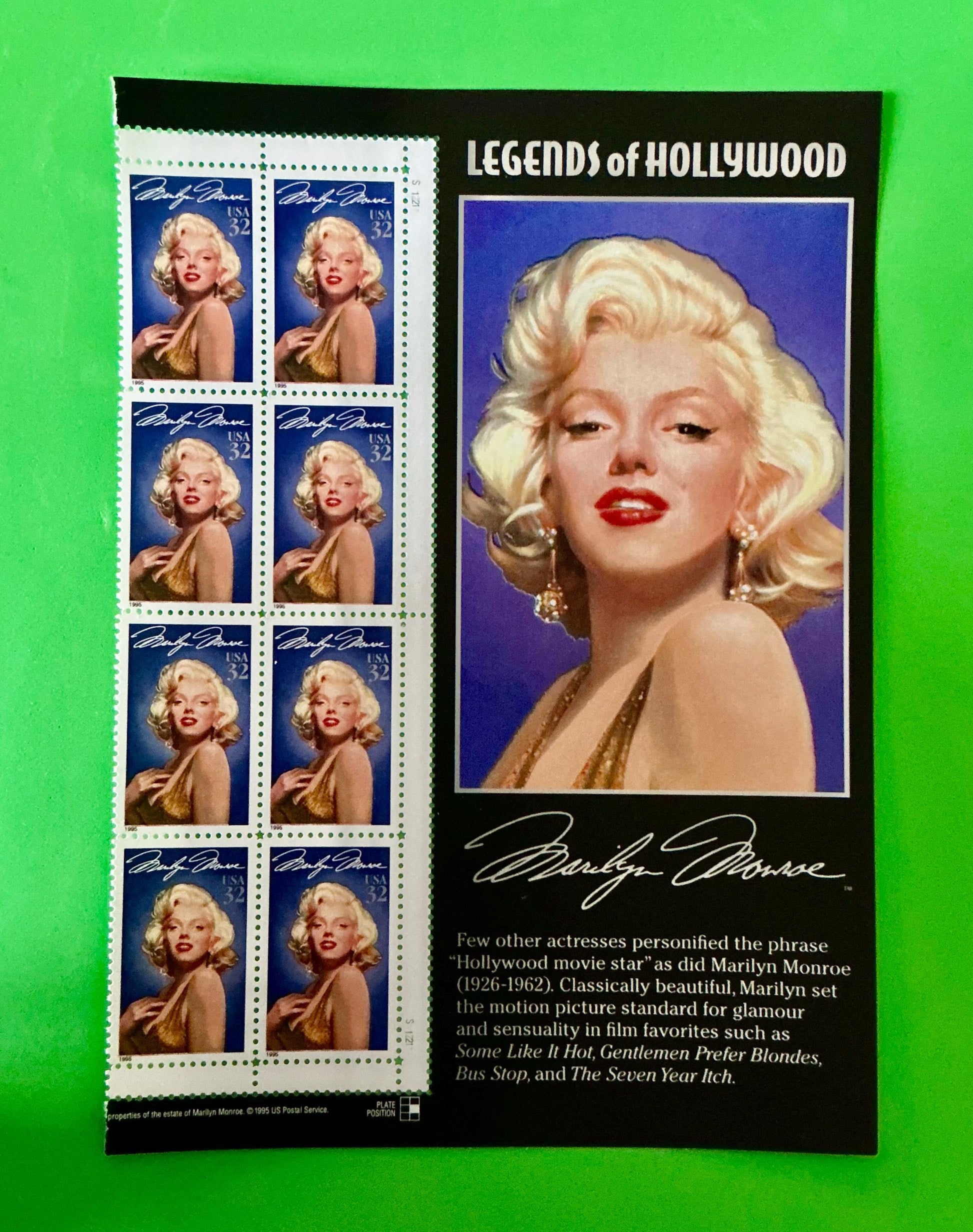 Issued on June 1, 1995, in Los Angeles, California, this 32-cent stamp was printed using the intaglio process, lending it a distinctive textured quality. The selvage includes the Legends of Hollywood series logo, adding collectible appeal. Perfect for philatelists, film enthusiasts, and admirers of Monroe's legacy, this stamp remains a cherished tribute to one of the 20th century's most unforgettable figures.
