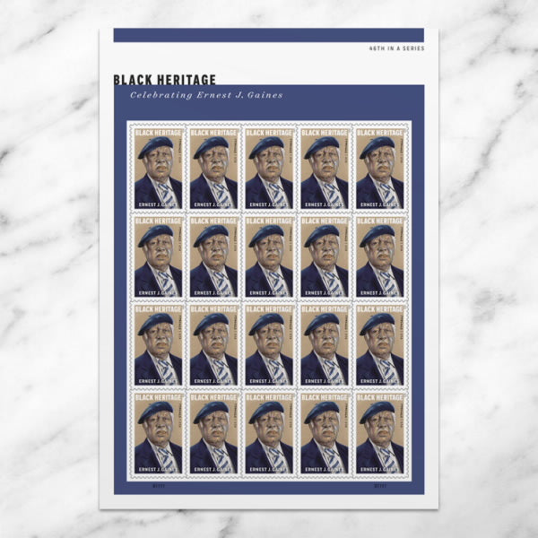 The 46th stamp in the Black Heritace series honors author Ernest J. Gaines (1933-2019). Best known for such novels as TheAutobiography of Miss Jane Pitman and A Lesson Before Dving, Gaines drew from his childhood as the son of sharecroppers on aLouisiana plantation to explore the untold stories of rural African Americans.