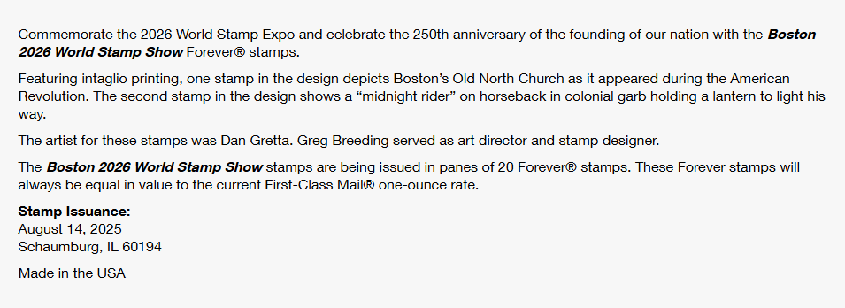NEW ! US Stamps - 2025 SC#6029-6030 - Boston 2026 World Stamp Show Forever Stamps - Sheet of 20 - OR - Single Stamp MNH