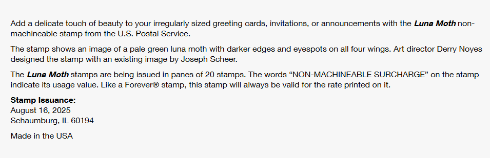 NEW ! US Stamps - 2025 SC#6031 - Luna Moth Non-Mach Surcharge Forever Stamps - Sheet of 20 - OR - Single Stamp - MNH