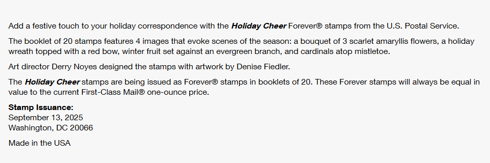 NEW ! US Stamps - 2025 SC#6033-6036 - Holiday Cheer Forever Stamps - MNH