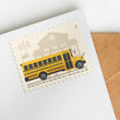 The stamp features a stylized illustration of a 21st century yellow school bus, in profile in front of a silhouetted schoolhouse that ismore evocative of an earier era. Just under the building's gable roof, a clock shows 10 minutes to 8: the morning bell will ringsoon.