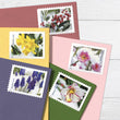 Gardens are places of beauty no matter the season. Even when the weather is chilly or wintry, each garden has its own speciaallure: plants gilded by the slanting autumn light; fantastical shapes and contours conjured by a blanket of winter snow;, and thevisible green haze of early spring plants ready to burst into bud. But bright, colorful flowers are not absent in the garden even in thecoldest months. Some plants bloom all winter in milder climates, while others thrive elsewhere despite-or because of-the cold.The artist started with dicital studies, then created the finished stamp art with oils on panel. These beautiful stamps featureilustrations of ten plants: camelia, crocus, hellebore, winterberry, pansy, plum blossom, grape hyacinth, daffodil, ranunculus, ancwinter aconite, which is also on the booklet cover.