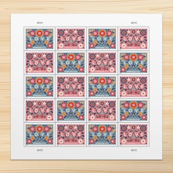 LOVE will be issued in panes of 20 Forever stamps. These Forever stamps will always be equal in value to the current First-Class Mail one-ounce price.