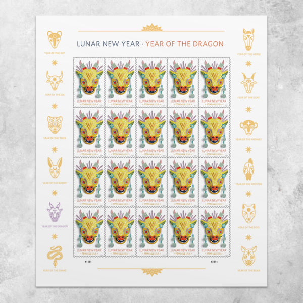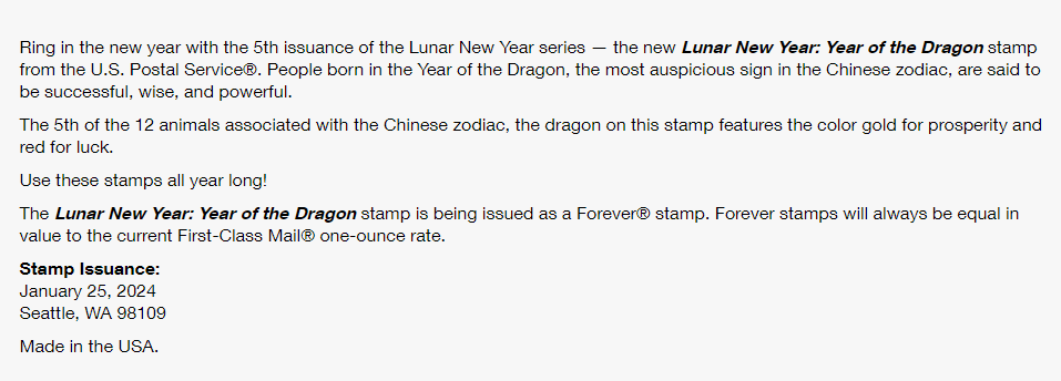 This is the Lunar New Year: Year of the Dragon Stamps issued by the U.S. Postal Service on January 25, 2024.