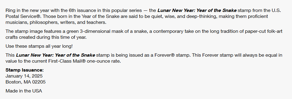 US 2025 SC#5952 - Lunar NewYear: Year of the Snake Stamps - Sheet of 20 - MNH