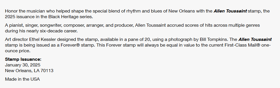 US 2025 SC#5957 - Allen Toussaint Forever Stamps - Sheet of 20 - MNH