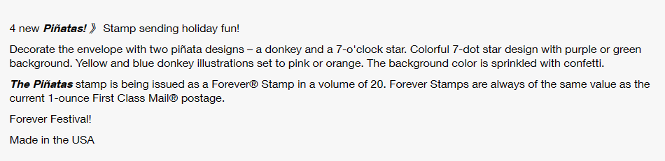 This is a set of Pinatas! forever Stamps sheets, including 20 stamps. These stamps will always be equal in value to the current domestic 1 Ounce postage price. These self-adhesive stamps are being issued in Sheets of 20 Stamps.