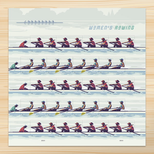 This issuance celebrates Women's Rowing, a graceful but demanding sport in which American women have excelledFour diferent stamp designs are featured in a pane of 20 stamps arranged as five staggered rows of four. The artwork, whichcovers the entire pane, is a stylized llustration of five eight-person crews on the water, apparently practicing or possibly racing.Although the rowers face lef, toward the stern ends of the "shells." they are moving toward the right. The ninth person in eachshel, at the left end, is the coxswain. She is the only one facing in the direction the shell is moving, as her iob is to steer. The shelsare so long, they are cut off by the edges of the pane.